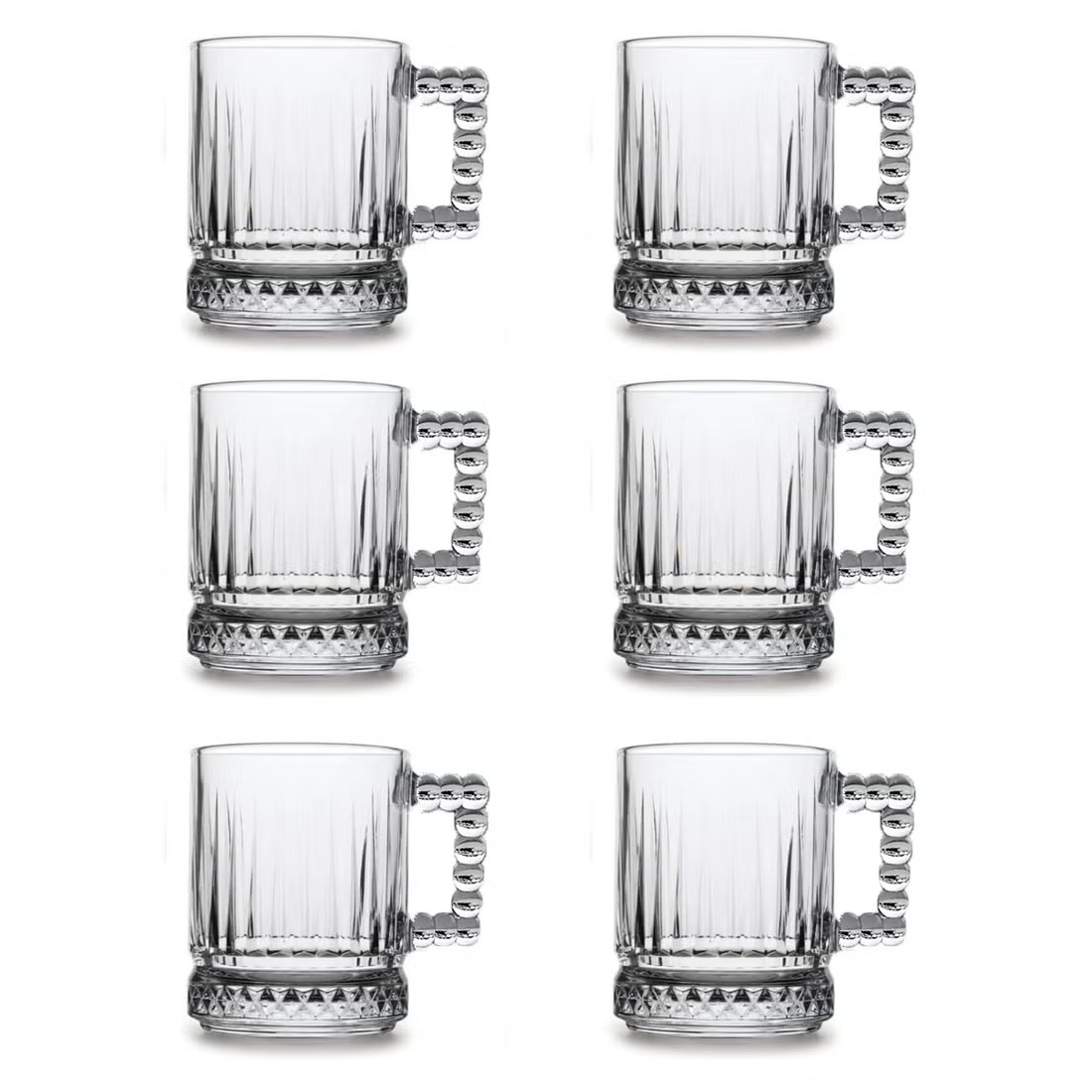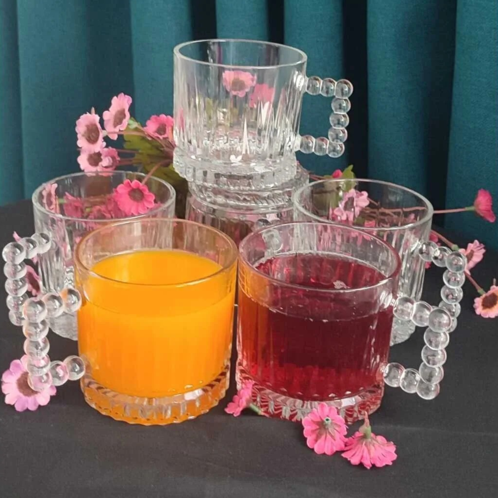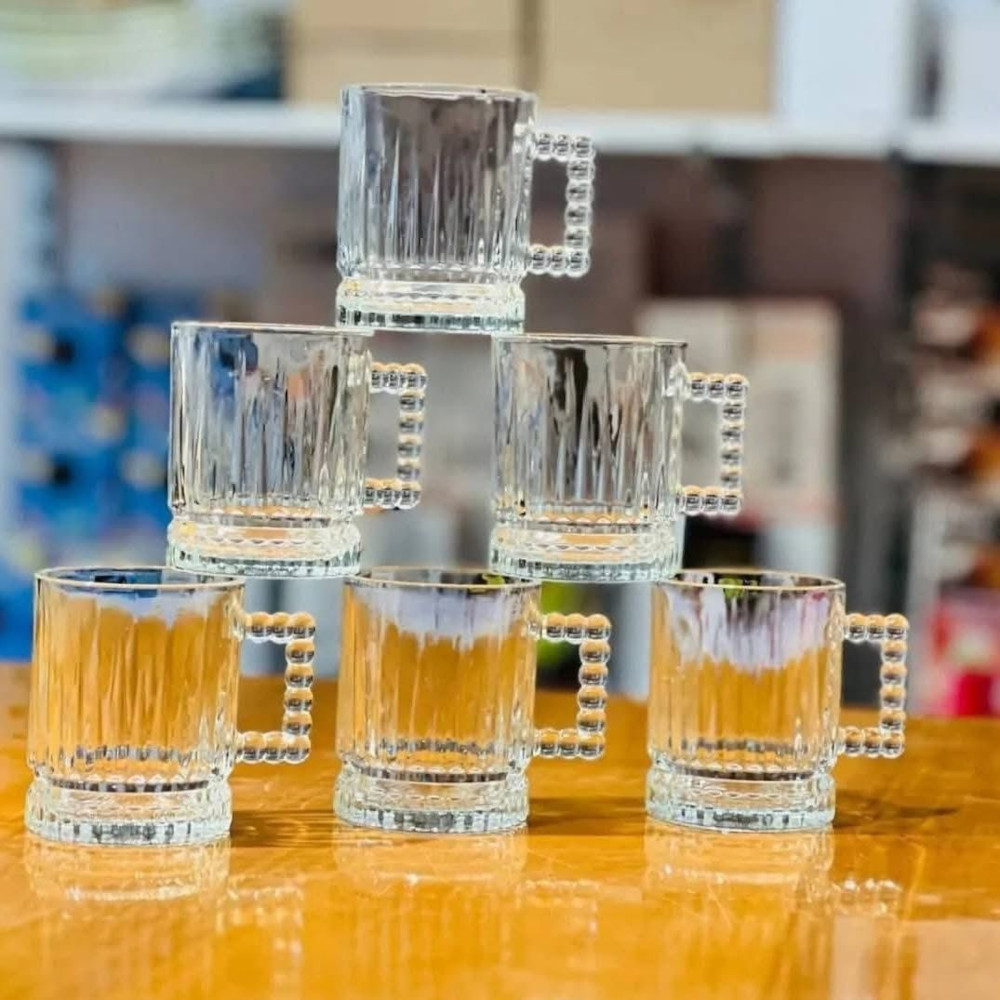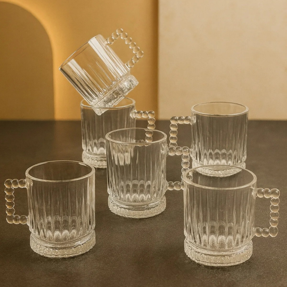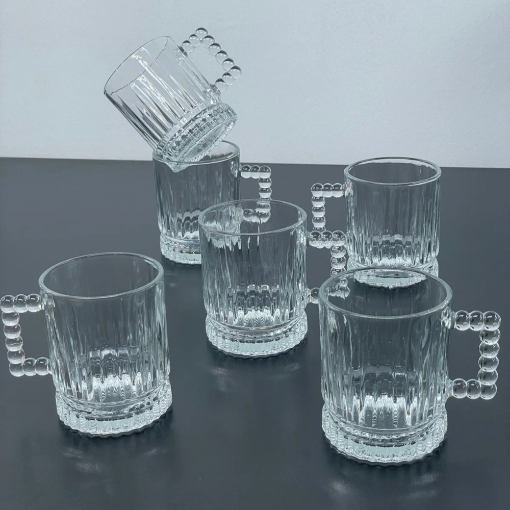 Set 6 căni MADGENIX din sticlă transparentă, 220 ml, cu mâner decorativ. Perfecte pentru ceai, cafea, deserturi sau decor de masă.