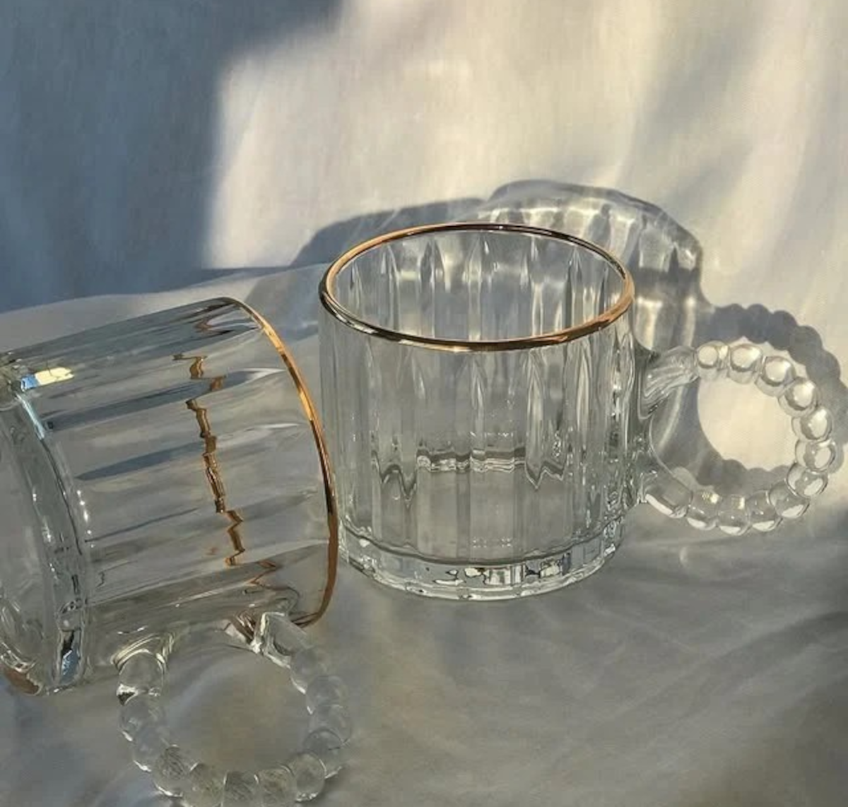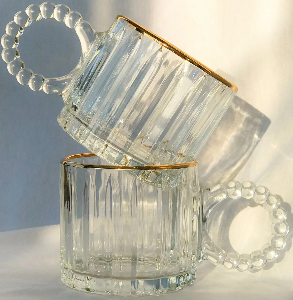 Set 6 Cesti din Sticla Borosilicata MADGENIX, Margine Aurie, 115ml, Design Texturat, Maner cu Bile pentru Espresso sau Ceai