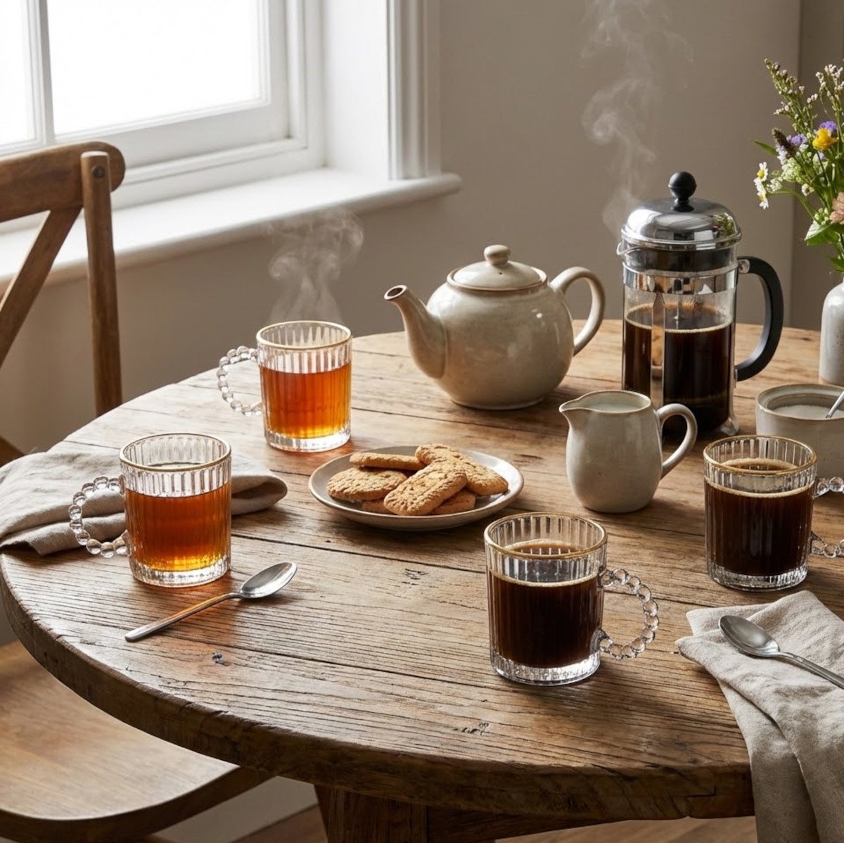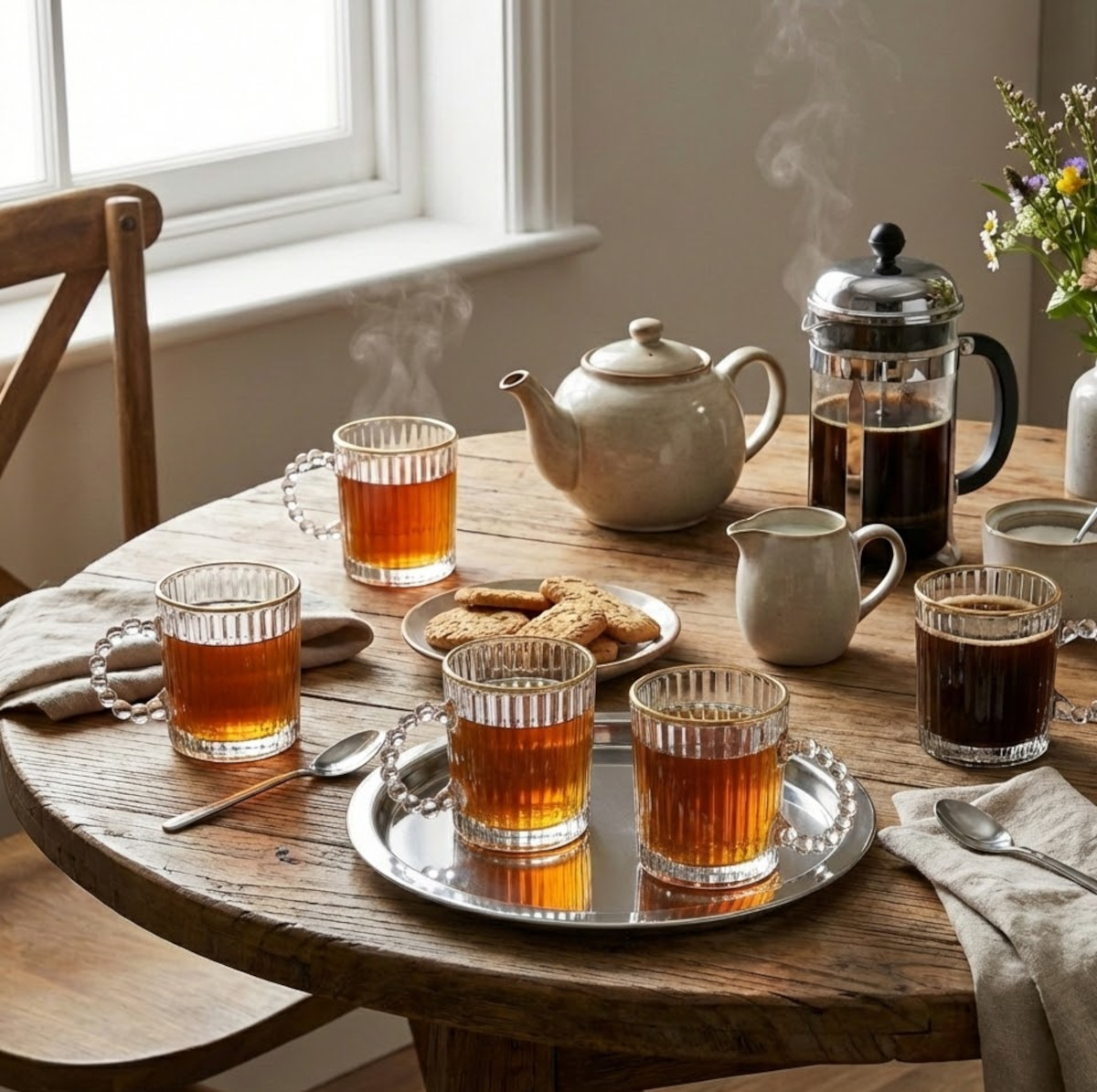 Ceai si Infuzii: Claritatea sticlei si marginea aurie fac din servirea ceaiului o experienta vizuala deosebita.