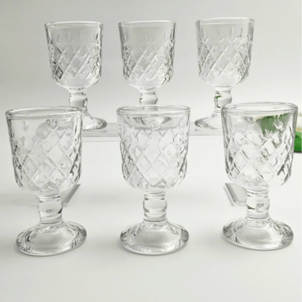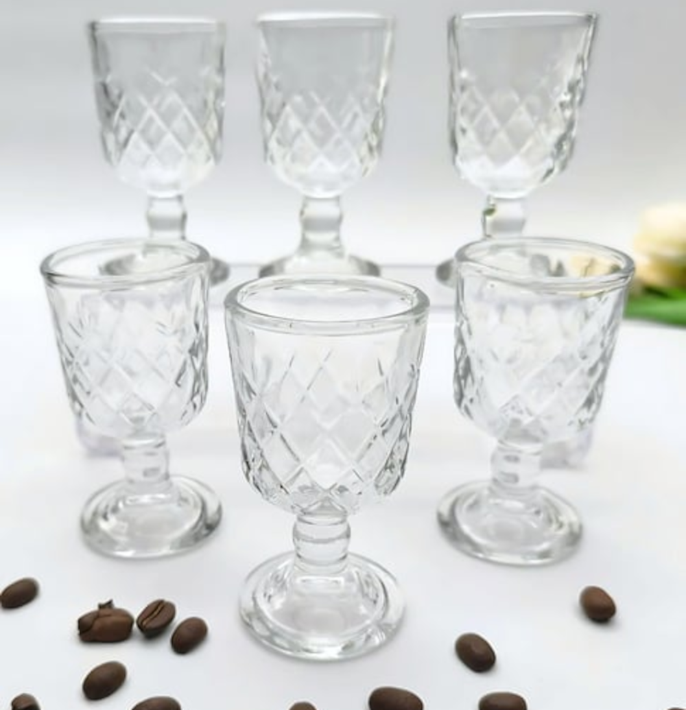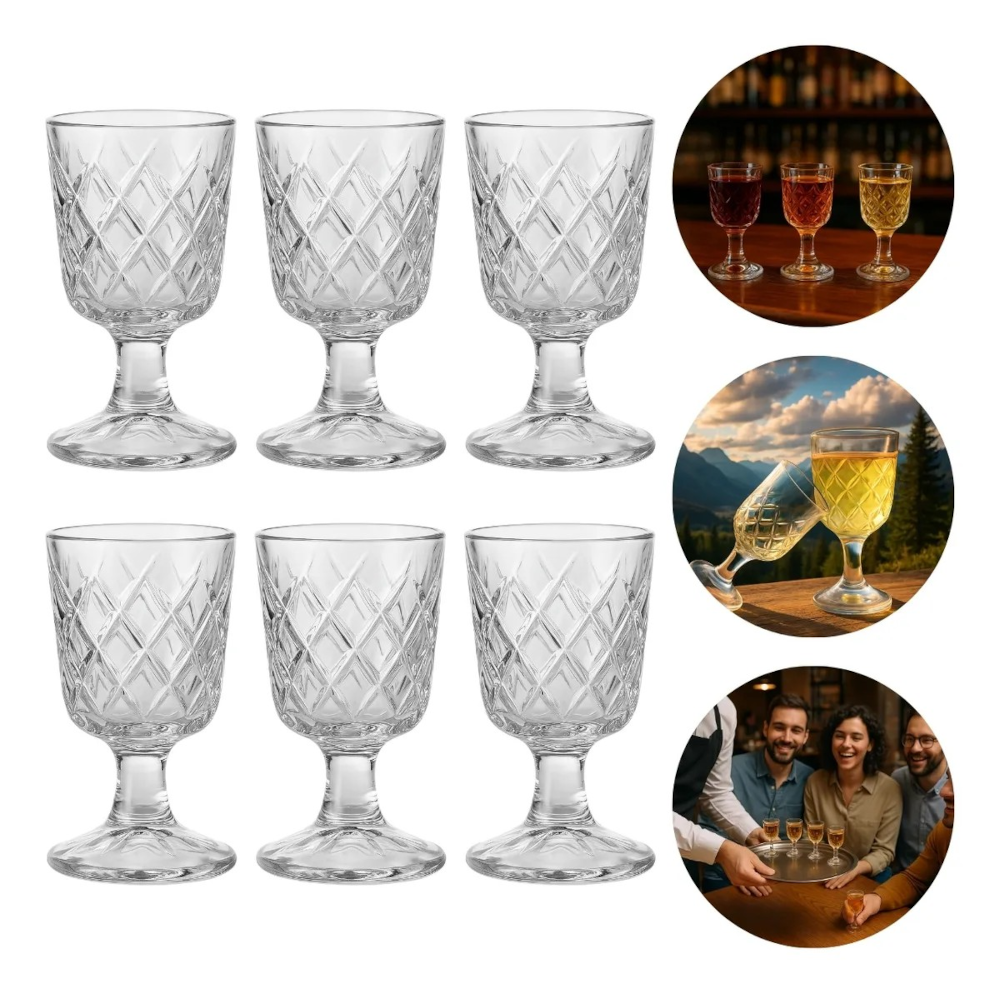 Redescoperă farmecul servirii rafinate cu Setul de 6 Pahare Aperitiv MADGENIX™ – 50 ml, din sticlă cu picior și design vintage elegant.